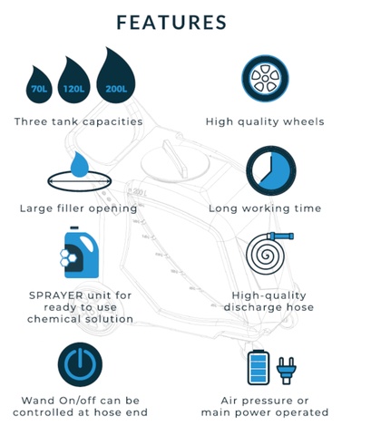 - Duża pojemność zbiornika 130 L – umożliwia długotrwałą pracę bez częstego uzupełniania roztworu.