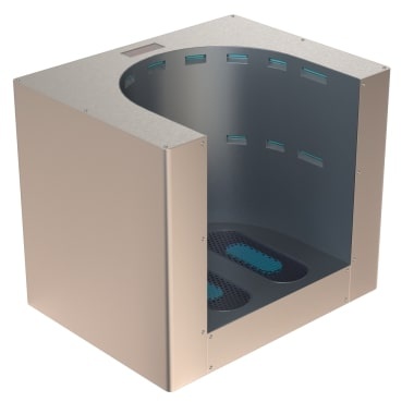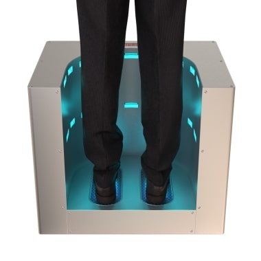 Urządzenie do dezynfekcji obuwia promieniami UV. W pełni automatyczna mata do dezynfekcji butów promieniami UV, która zabija do 99,99% narażonych mikroorganizmów, takich jak wszystkie niebezpieczne patogeny, nie tylko na podeszwach obuwia ale całym obuwiu znajdującym się komorze dezynfekcyjnej, oraz ochraniaczach na buty w zaledwie osiem 8 sekund.