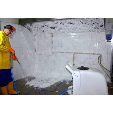 Urządzenie korzysta z wcześniej przygotowanego roztworu środka chemicznego oraz wody i wyrzuca pianę przez wąż wylotowy i nierdzewną dyszę