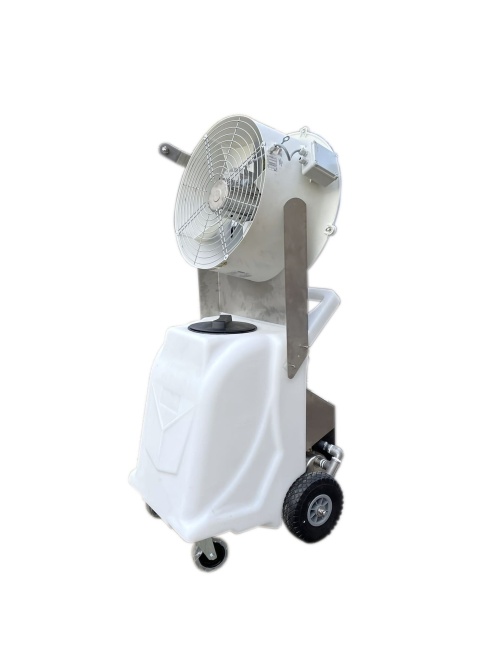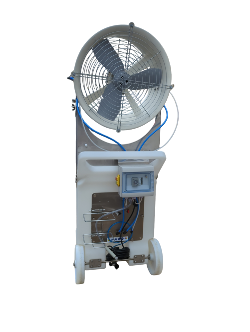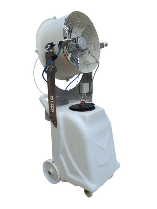 To urządzenie do zamgławiania pobiera płyn ze swojego zintegrowanego, wysokowydajnego zbiornika i przekształca go w drobną mgłę. Wbudowane urządzenie mieszające stale i równomiernie miesza płyn, zapewniając stałą jakość rozpylania. Zintegrowany wentylator następnie wyrzuca mgłę na zewnątrz, a regulacja prędkości pozwala kontrolować jej zasięg. System ten zapewnia wydajne i równomierne pokrycie dużego obszaru.